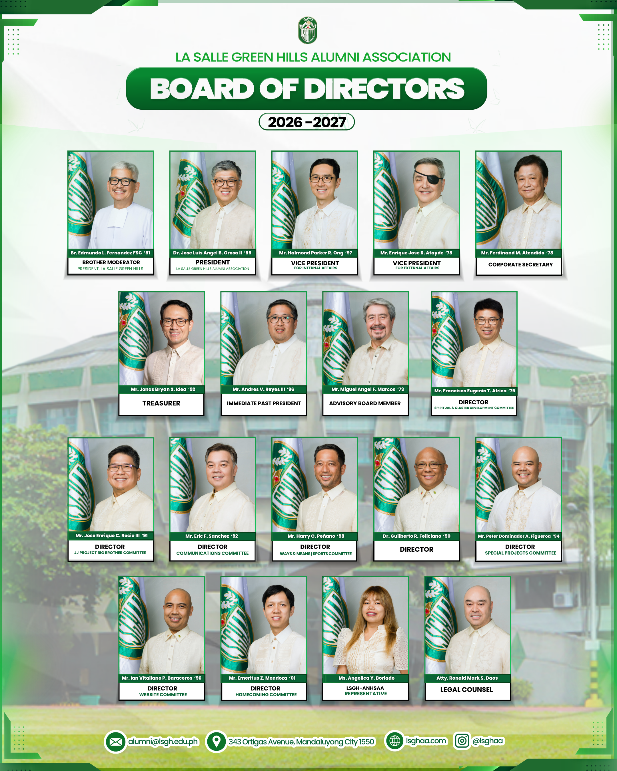 The La Salle Green Hills Alumni Association marks the beginning of a new year and the continuation of a meaningful chapter with the formal induction of the LSGHAA Board of Directors for School Year 2026 to 2027. The ceremony was officiated by our LSGH Brother Moderator, Br. Edmundo L. Fernandez, FSC, and held on April 15, 2026, at the Br. Rolando Dizon Center for Alumni Affairs.
